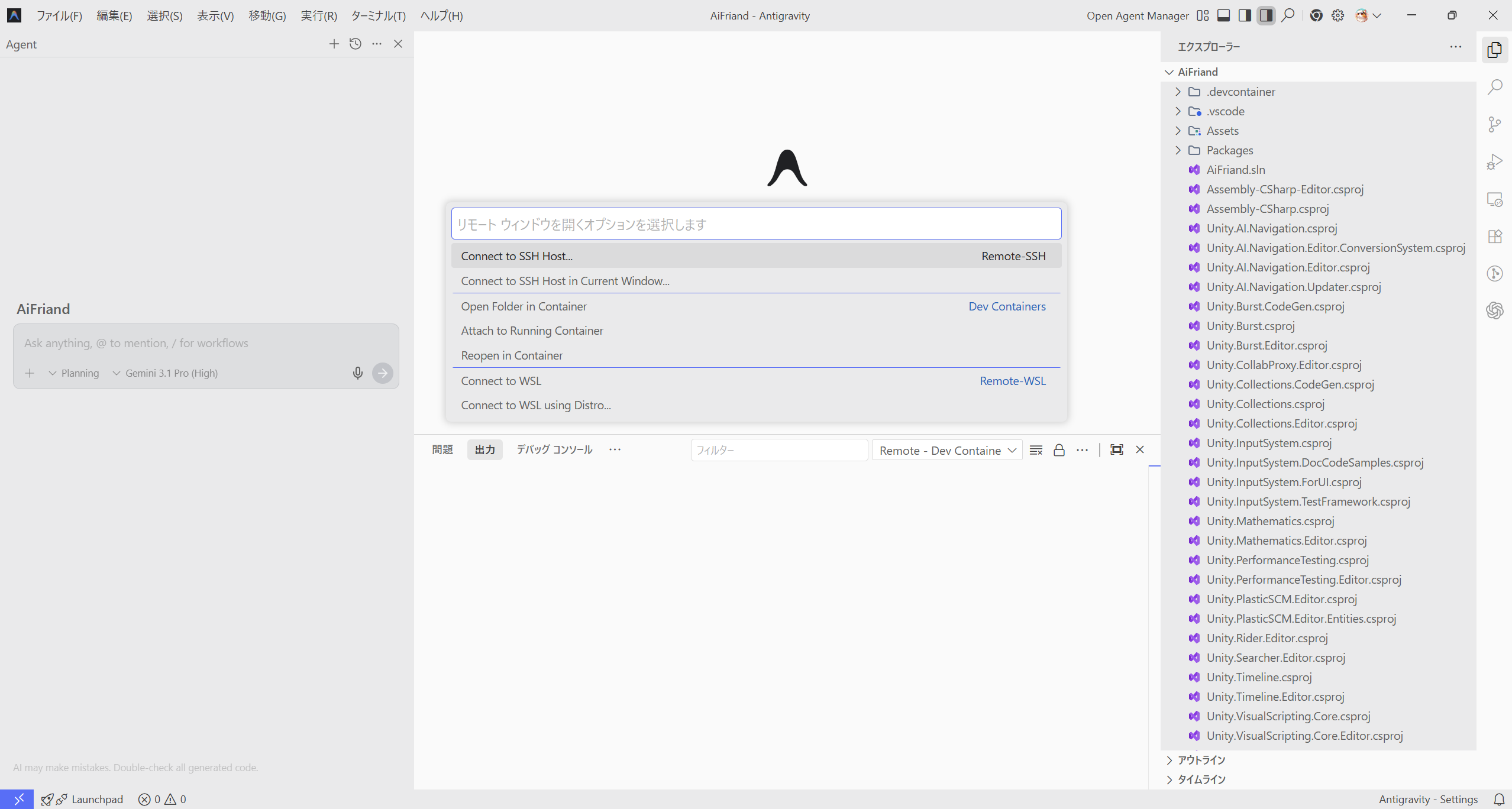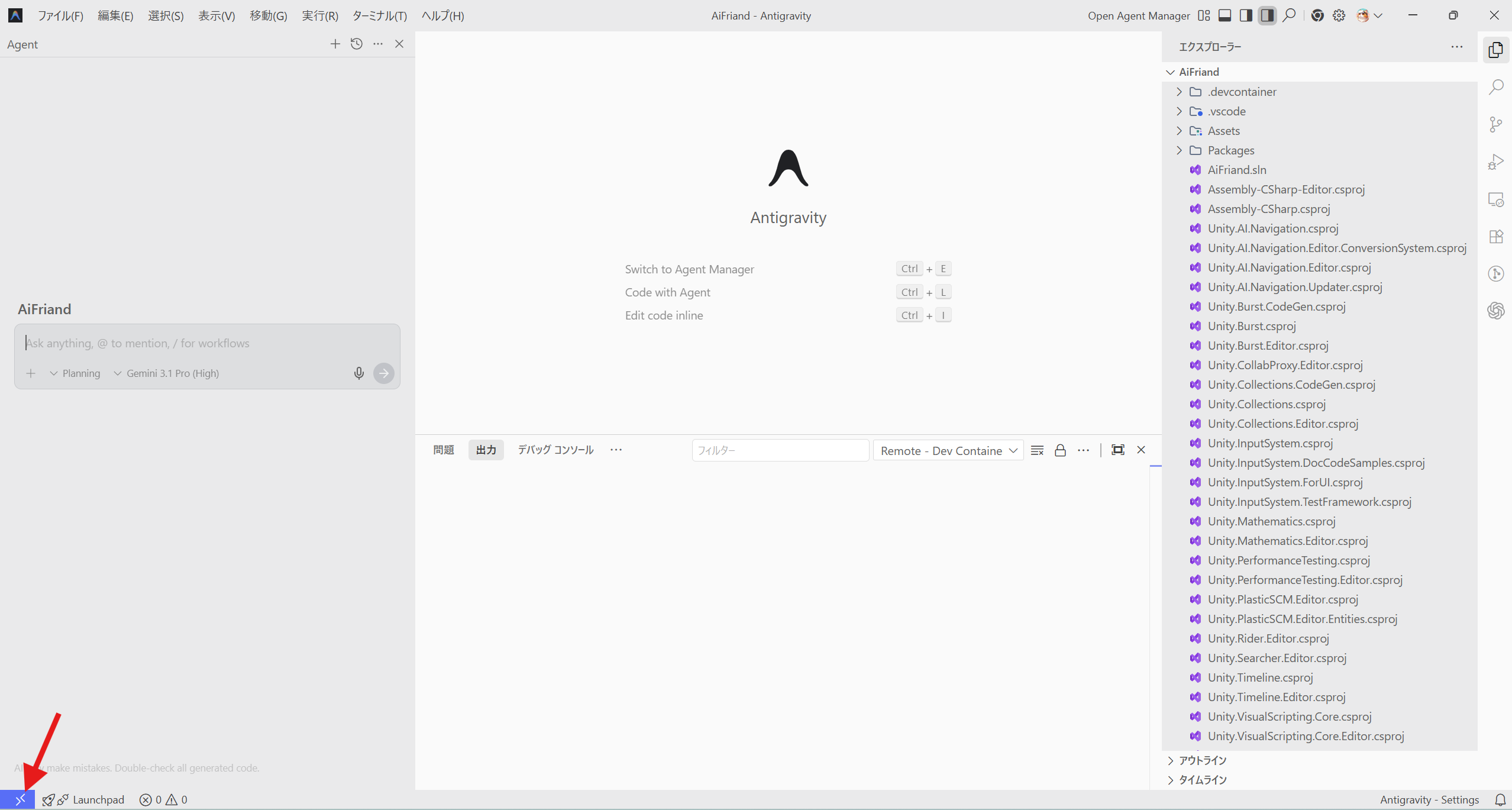 これで自動的にDocker上にコンテナが作られ、安全な隔離環境でAntigravityが開きます!